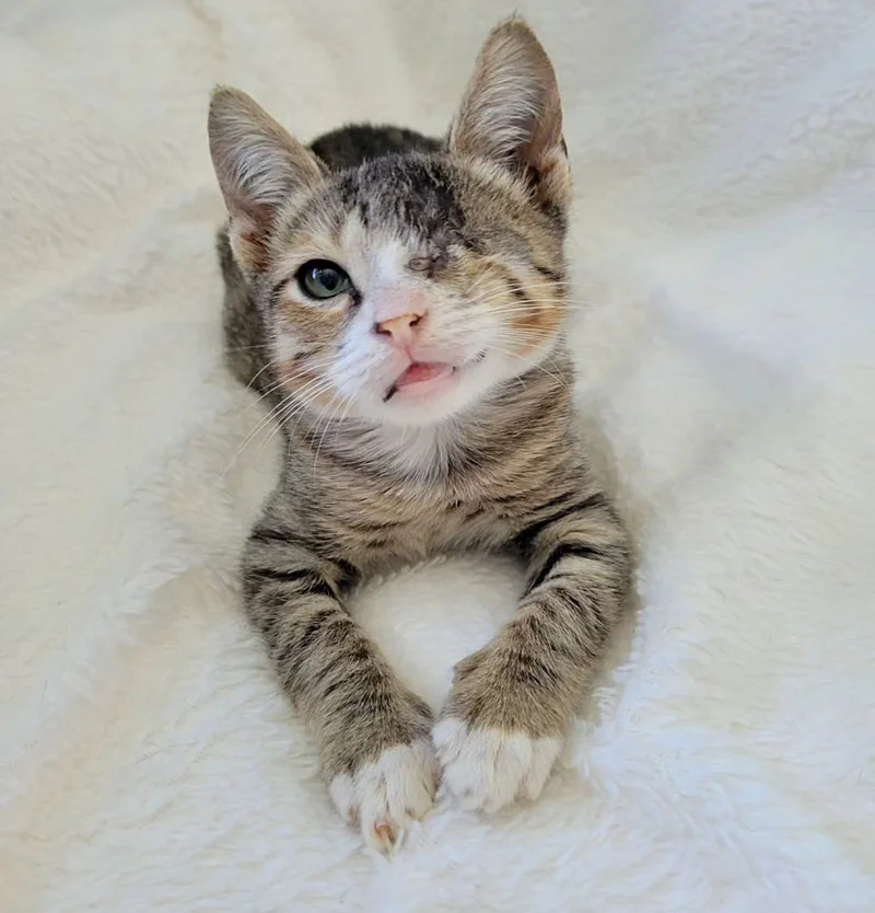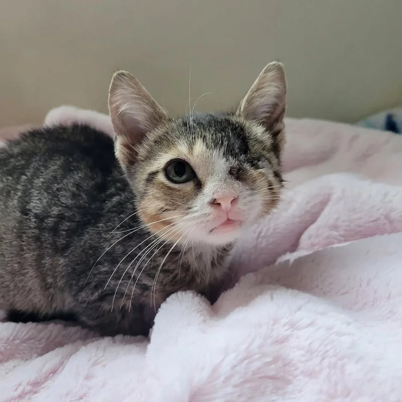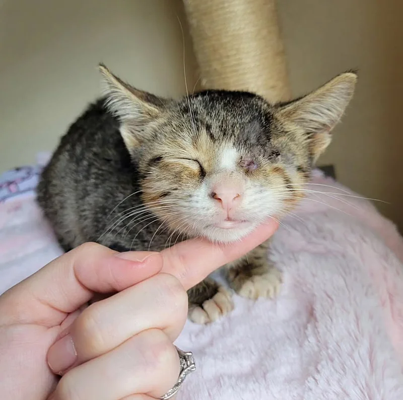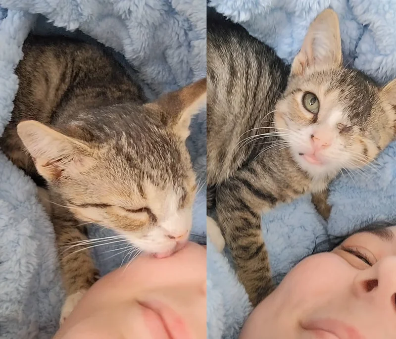 Na een operatie aan zijn oog bracht Nadija hem naar huis, waar ze hem liefdevol opving met warme dekens en een veilige plek. Chip, nog piepklein en bedekt met vlooienvuil, voelde zich al snel veilig en viel vredig in slaap.