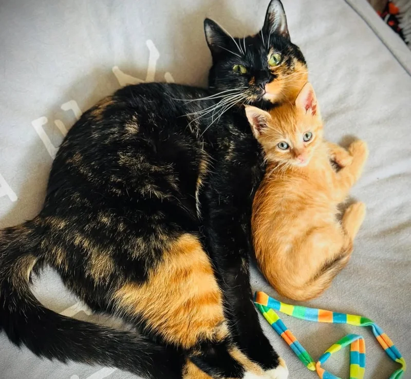 Twee weken later mocht Mariya kennismaken met Gracie, de huiskat van Jill. Het was liefde op het eerste gezicht. Gracie, een ‘wobbelkat’ met cerebellaire hypoplasie, omarmde het kleine katje alsof ze haar eigen was. Binnen de kortste keren waren ze onafscheidelijk.